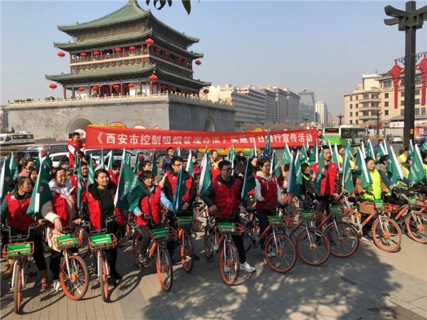 ▲图为《西安市控制吸烟管理办法》实施百日骑行宣传活动现场。
