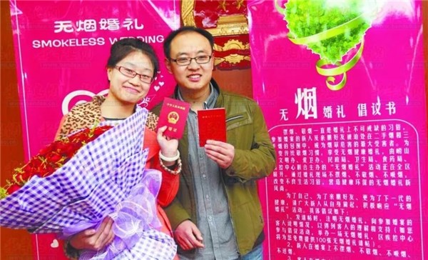 ▲图为青岛市第一对签约无烟婚礼的新人,承诺在婚宴上不摆烟、不敬烟、不吸烟、不送烟。