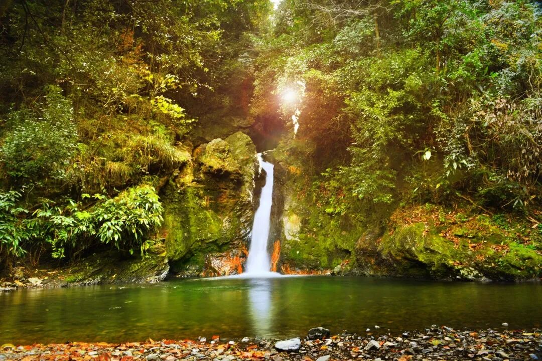 此处森林葱郁,植被茂密,满眼绿意盎然与壮观的瀑布相映成趣,宛若一幅水墨画卷。置身其中,感受山间自由的风,瀑布从山顶飘洒而下,任其洗涤心灵,静静地享受着独有的清幽与静谧。